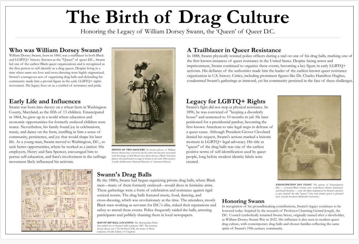 America’s first self-identifying drag queen, LGBTQ activist and former enslaved person William Dorsey Swann was born in 1860 into slavery in Hancock, Maryland. Swann, his parents and his 12 siblings were enslaved on a plantation owned by Ann Murray. When the Civil War ended, Swann’s parents were able to buy a farm which put them in a better position financially than most other former enslaved people. Swann’s first job was as a hotel waiter. He also learned how to read and write in his spare time. At the age of 24, Swann stole one item from his employer’s home and books from the Washington Library Company and when he was caught he pled guilty to petty larceny. He was sentenced to six months in jail. After that encounter with the law, Swann decided to focus on furthering his education and making money to help his family. The people who were responsible for him going to jail argued later that he should get a presidential pardon because he was “free from vice, industrious, refined in his habits, and associations, gentle in his disposition, courteous in his bearing.” His former employers even offered him a job as the college janitor. Swann began hosting a series of private, secret drag balls in Washington, D.C. in the 1880s and 1890s and called himself the “queen of drag.” Most of the attendees were former enslaved men who dressed in satin and silk dresses and danced the nights away. These people were known as the “House of Swann.” The invites had to be sent out in secret due to existing laws and the social mores of the time. Swann’s signature dance was the cakewalk that inspired the voguing seen in Harlem’s ball scene during the Harlem Renaissance and drag balls since that time. Because Swann went against the social norms of the time, he was arrested in police raids on “female impersonation” charges many times. One of these arrests happened on April 12, 1888, at Swann’s birthday celebration. The Washington Post reported at the time that Swann was “arrayed in a gorgeous dress of cream-colored satin.” This arrest enraged Swann and his statement to the arresting officer, "You is no gentleman,” marks the first recorded instance of LGBTQ resistance/activism in America. Due to the fact that these arrests (twelve others were arrested that night) were made public in local newspapers with shaming language is the reason why Swann’s life story is known the present moment. Swann, who pled not guilty, was convicted of “keeping a disorderly house” aka running a brothel and sentenced to 300 days in jail on Jan. 3, 1896. He appealed to then President Grover Cleveland for a pardon with 30 people signing on as supporters but it was denied on July 29, 1896. Swann made history again with his pursuit of legal and political action on behalf of the LGBTQ community. He also had to stop organizing and participating in drag events due to the danger of being arrested and convicted of these crimes for a second time. Swann also identified as a gay man and had a romantic relationship with Pierce Lafayette (who was previously owned by Confederate Vice President Alexander H. Stephens) who also attended Swann’s balls. Lafayette and former enslaved Black man Felix Hall were also intimate with each other. These same-sex relationships between former enslaved Black men are the earliest documented ones to have taken place in America. Swann died in 1925 at the age of 65 in Hancock, Maryland and was cremated. Attempting to erase Swann’s existence, local officials burned his home down. In 2021, author Channing Gerard Joseph published Swann’s biography, The House of Swann: Where Slaves Became Queens. In 2022, the already existing Swann Street in Northwest Washington, D.C. was officially renamed after William Dorsey Swann by the Dupont Circle Advisory Neighborhood Commission. On Aug. 8, 2025; a marker was placed in T Street Park to honor Swann at the intersection of Swann Street, New Hampshire Avenue, 17th Street, and T Street, N.W.